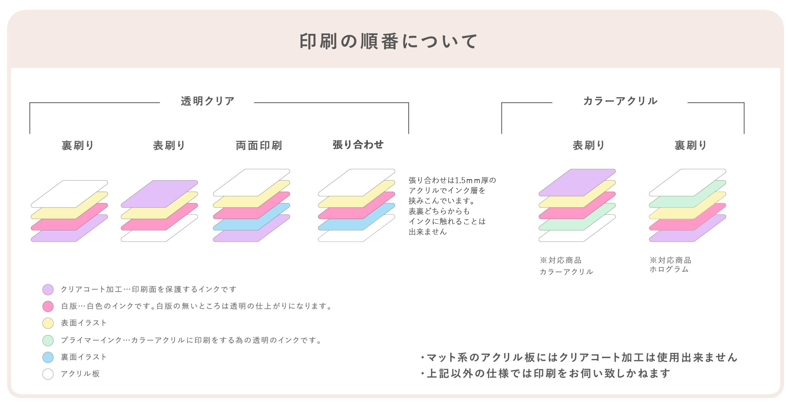 - アクリル板への印刷は光の影響を受けやすく、絵柄が少し暗く(薄く)見える場合があります。