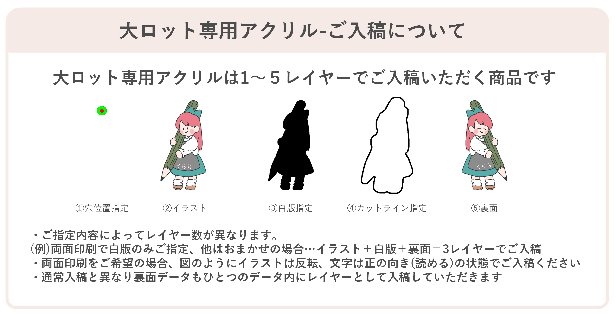 - 穴の指定がない場合や、pngファイルでご入稿頂いた場合、弊社が穴あけ位置を判断して制作いたします。
